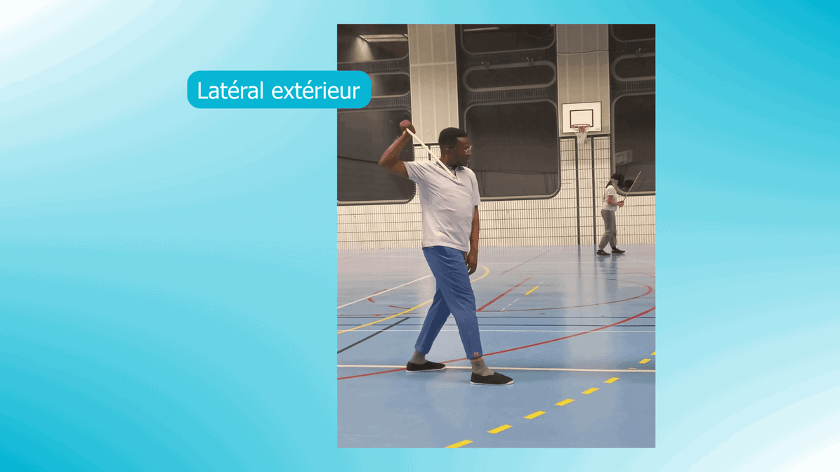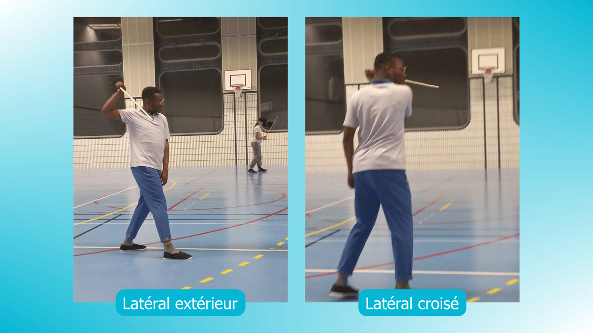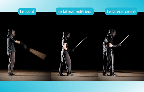 Pour faire de la canne de combat, on doit avant tout connaître les six différents coups, les seuls acceptés pour qu’une touche soit valide. L’objet de cette séance de découverte a donc été l’apprentissage, en plus du salut, de deux premiers coups : le latéral extérieur et le latéral croisé. Parce qu’il est difficile d’expliquer ces techniques en mots, je laisse des membres de l’ASCA te les montrer en images :