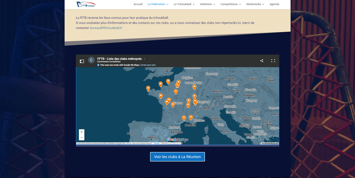 La fédération française des clubs français de tchoukball propose une carte des clubs de tout le pays (avec ça, facile de voir s’il y en a un près de chez toi 🔍) : fftchoukball.fr/liste-des-clubs/