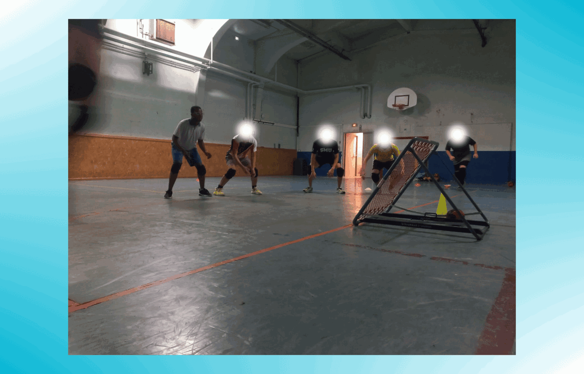 Tours de gymnase, pas chassés, sauts, flexions, gainages : au Paris First Tchoukball Club, on commence l’entraînement par un échauffement rigoureux – avec des genouillères, car il n’est pas rare de devoir défendre à genou ou de plonger au sol pour rattraper une balle.