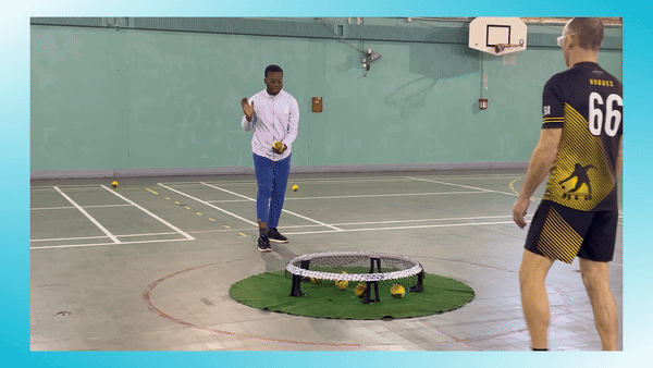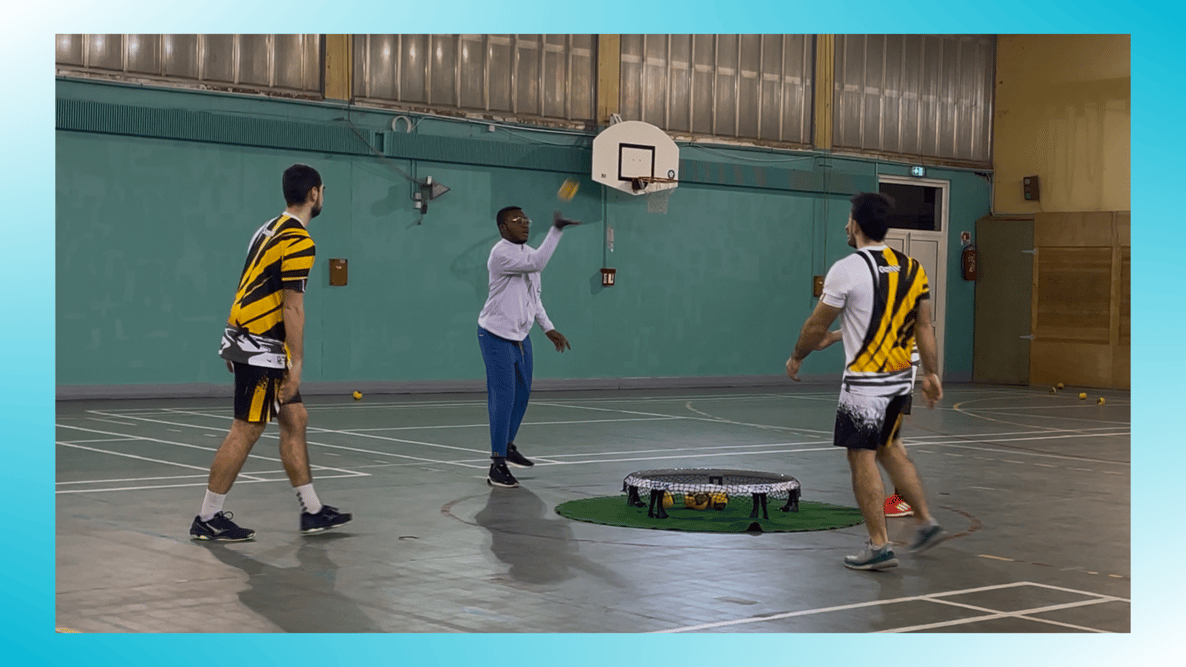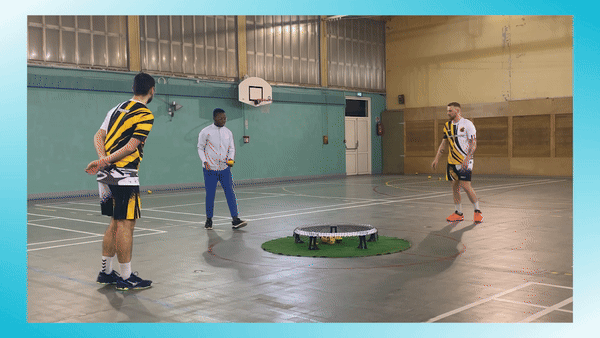 Règles de base qui, au premier regard, ont l’air plutôt simples. Prends deux équipes de deux joueurs (idéalement). Entre eux quatre, un filet de trampoline de 90 centimètres de diamètre et 20 cm de hauteur. Place dans leur main un ballon d’une dizaine de centimètres de diamètre.
